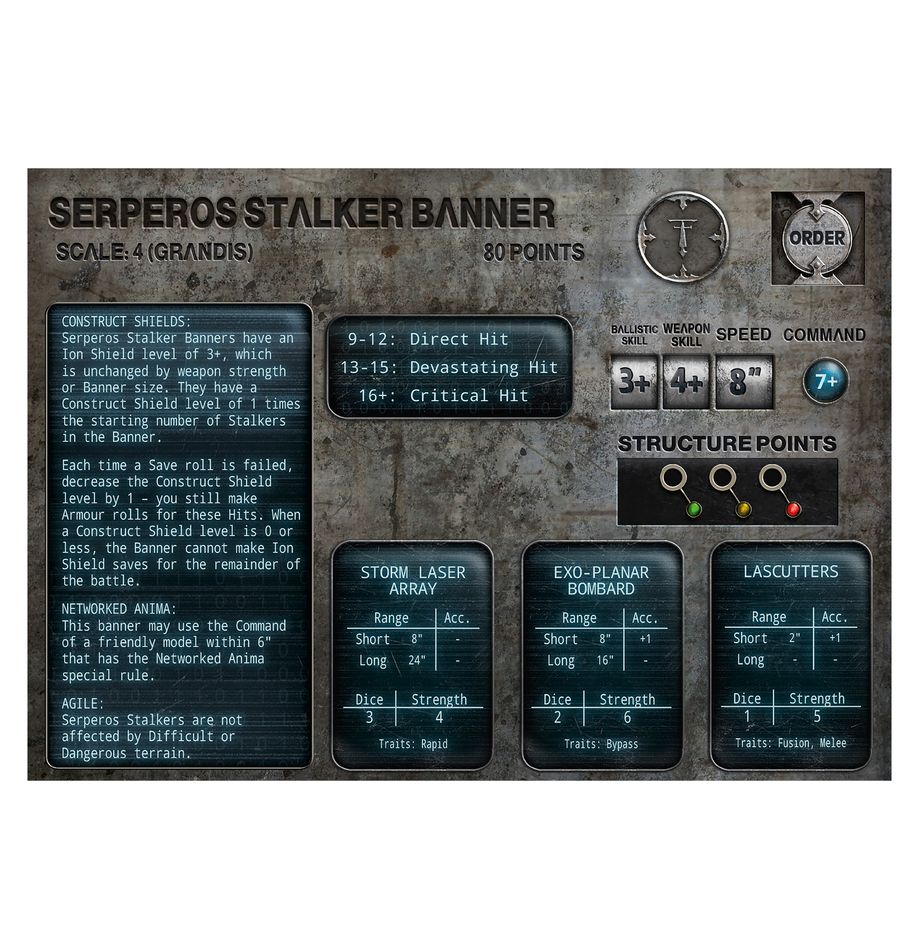 The Serperos Heavy Stalker is a heavily armoured and heavily armed siegebreaker for the Dark Mechanicum. Thick armour plates and several shield generators provide protection against all but the heaviest of firepower. Its most commonly employed weapon is the exo-planar bombard – a deadly ætherpowered weapon capable of shredding armour and flesh with equal ease.