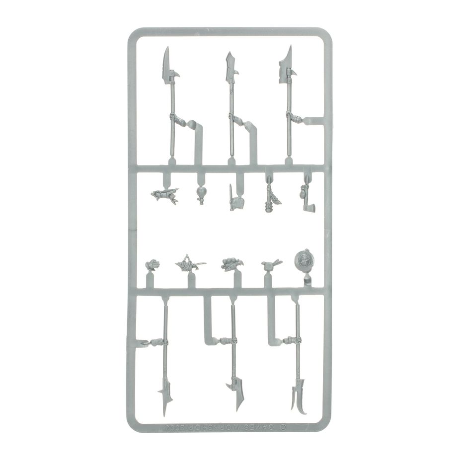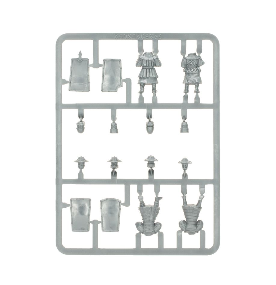 This multipart plastic kit builds 36 Men-at-Arms, peasant footsoldiers from the Kingdom of Bretonnia. Each of these stalwart serfs carries a bladed polearm and a hefty shield, protected by simple armour befitting their rank. The kit provides two command sections – each comprising a standard bearer, a doughty Grail Monk, a musician with a choice of instruments, and a Yeoman champion – allowing you to field two regiments of 18 models, or a massive shieldwall of 32 models.
