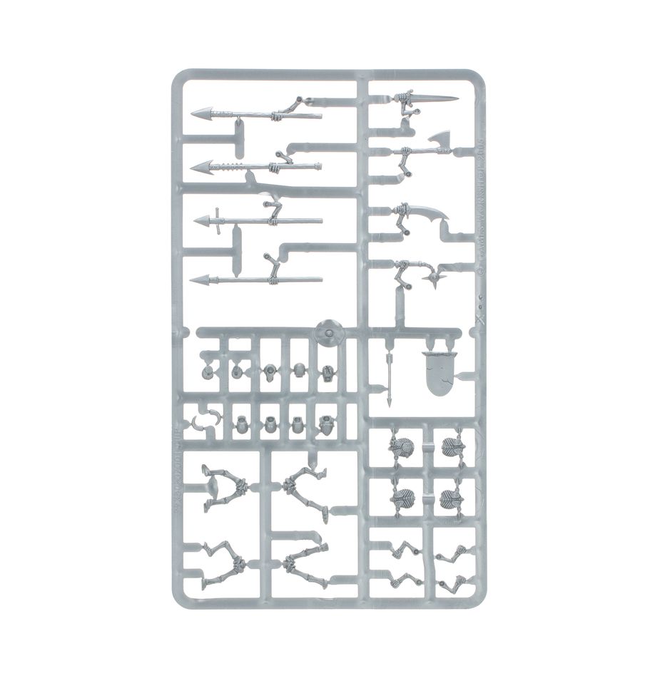 This multipart plastic kit builds 36 Skeleton Warriors, raised to serve the Tomb Kings of Khemri. Each of these undead footsoldiers carries a tall Nehekharan shield alongside a thrusting spear or a one-handed weapon – alternatively, they can be built as Skeleton Archers armed with warbows and quivers of arrows. This kit also provides all the command upgrades you'll need, whether you choose to field your Skeleton Warriors in small groups or as one great mass – you can build musicians, champions, and standard bearers with a choice of icon tops.