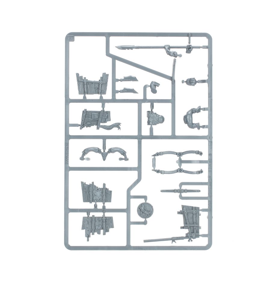 This multipart plastic kit builds 2 Orc Boar Chariots, for use in Orc & Goblin Tribes in games of Warhammer: The Old World. The Orc crew can be equipped with hand weapons and cavalry spears, and the chariots come with with different cosmetic build options, including a fierce-looking bosspole. The kit also includes a choice of interchangeable heads for the Orc crew and the option to decorate one of their helmets with an intimidating jaw icon.