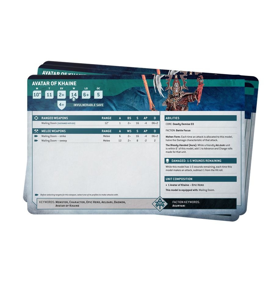 This set of 71 cards will help you keep track of your Aeldari in games of Warhammer 40,000 with individual datasheets for every unit – detailing their profiles, wargear, options, and special abilities. You'll also find a reference card for the Aeldari army rule and special datasheet cards for use in Combat Patrol games.