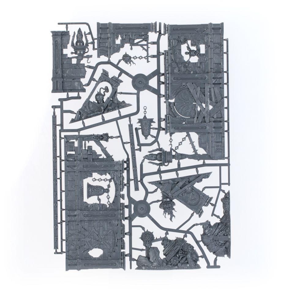 4x plastic push-fit terrain features: This terrain set shows fractured Sigmarite architecture that has been desecrated with the twisted icons and aesthetics of the Skaven. It is also ideal for playing out the Spearhead games featured in the Spearhead: Fire and Jade book.
